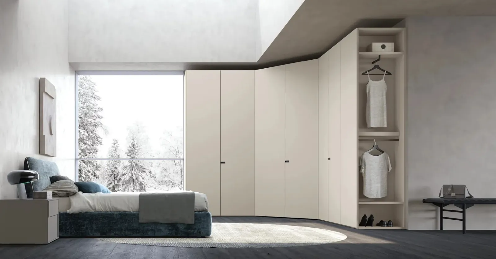 Cerchi un guardaroba in laccato opaco? Clicca e scopri armadiature ad angolo con ante battenti di Adok.