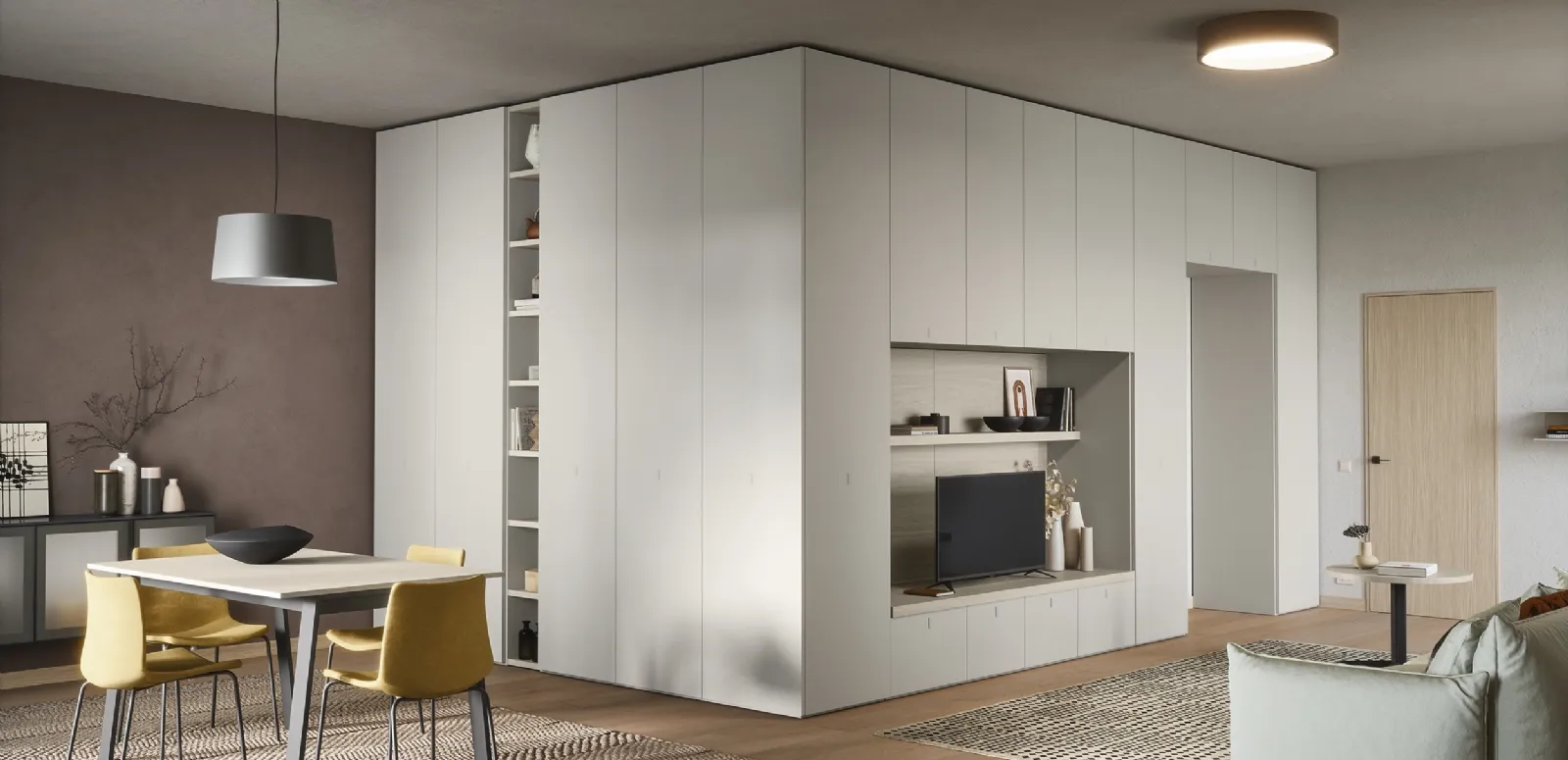 Cerchi un guardaroba in melaminico? Clicca e scopri armadiature ad angolo con ante battenti di Cinquanta3.