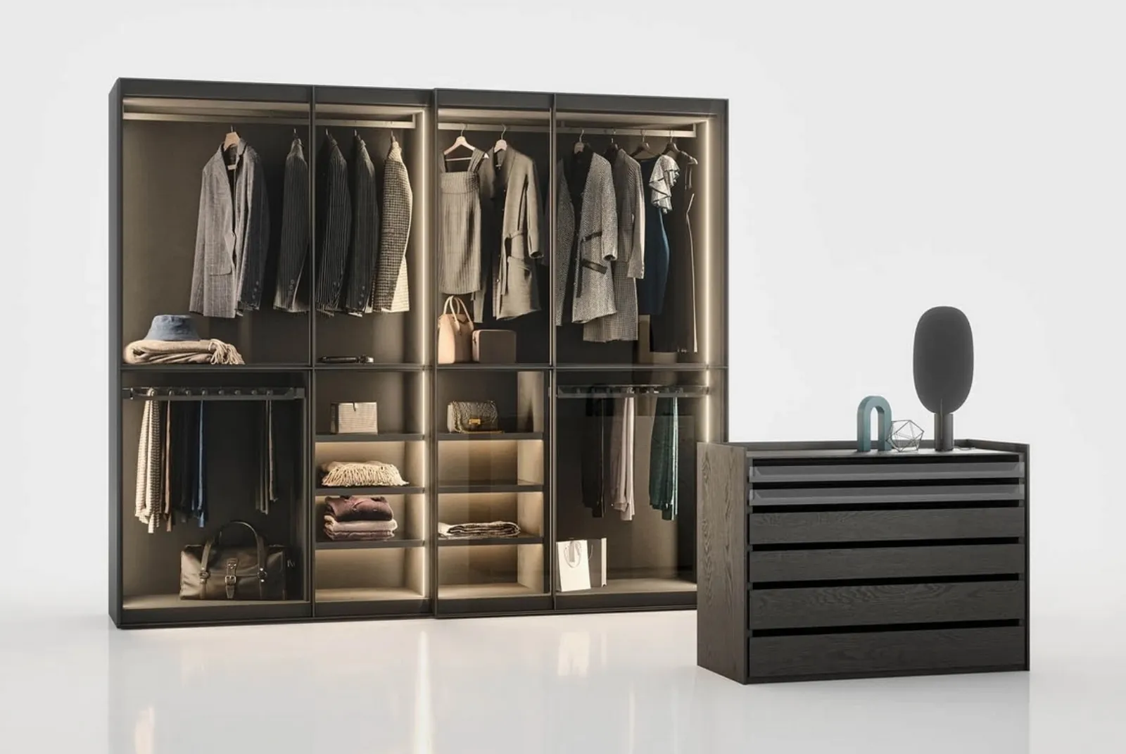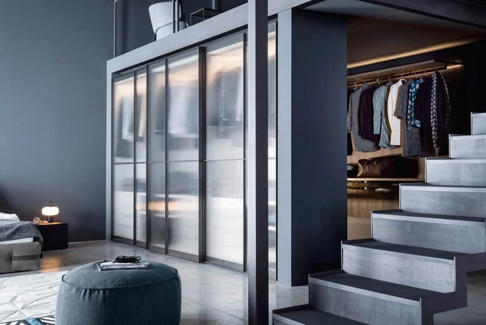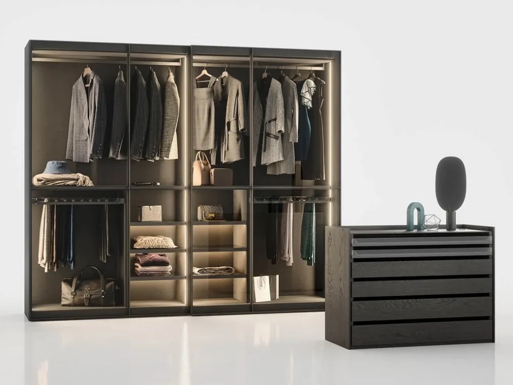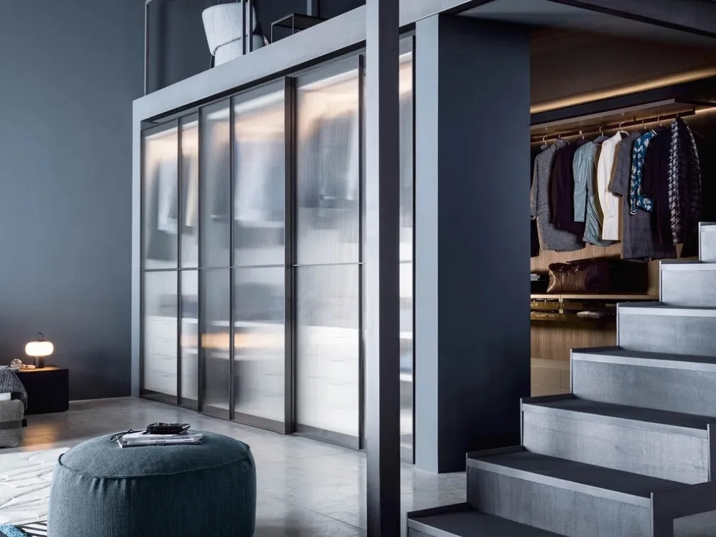 Se desideri armadiature a muro con ante scorrevoli, clicca e scopri l'armadio Layer Vetro scorrevole di Novamobili in vetro.