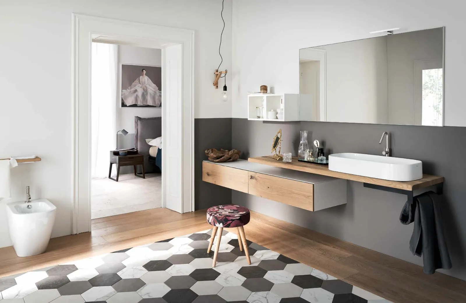 Mobili bagno sospesi in legno del brand Alta Corte: clicca e scopri l'arredo bagno moderno Gap 01 per la stanza del benessere.