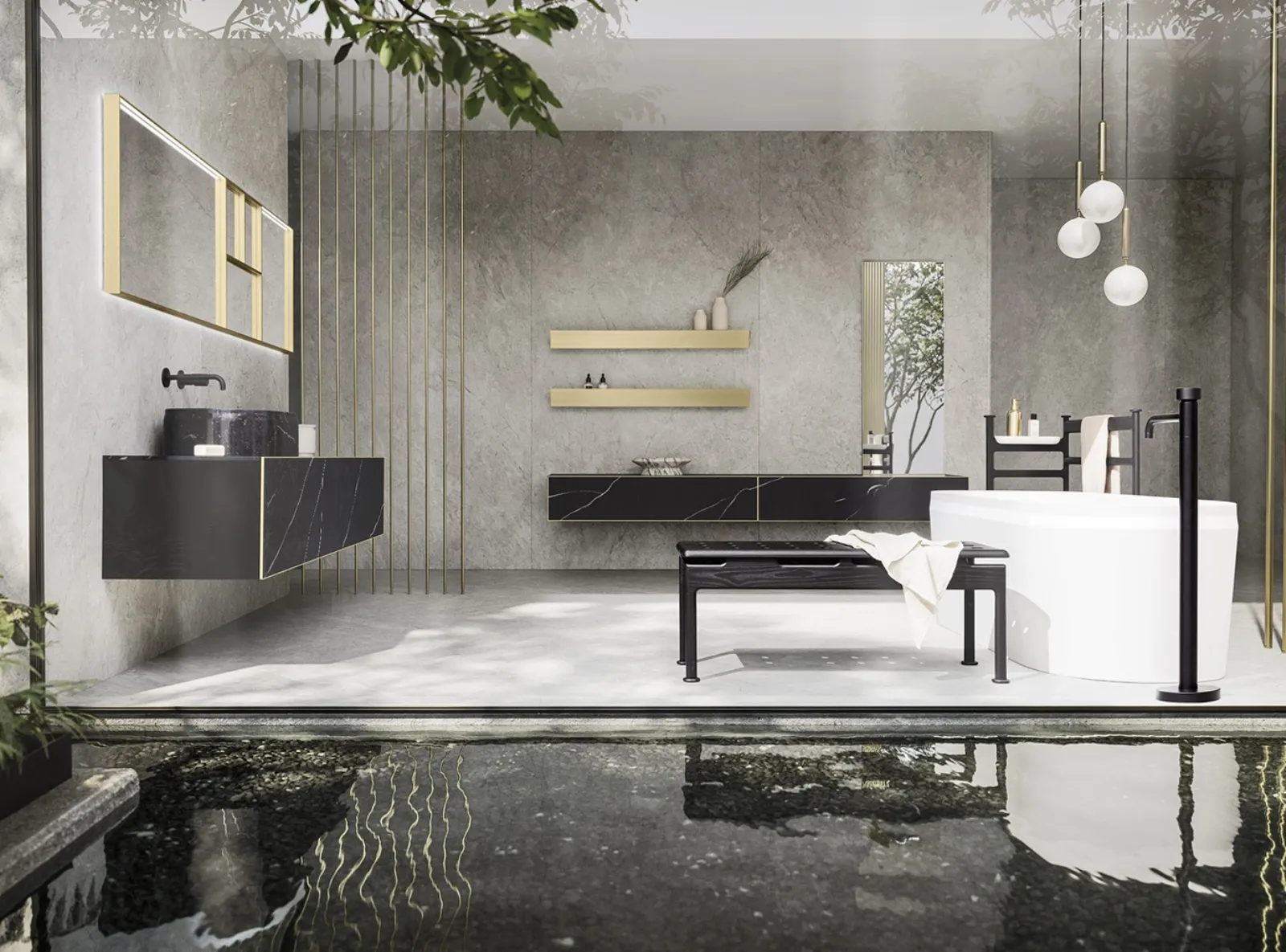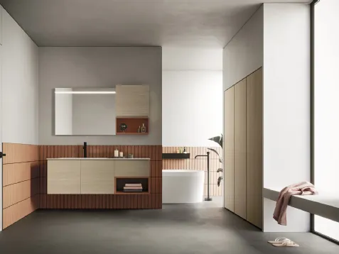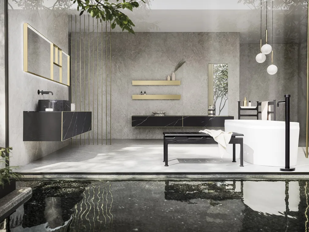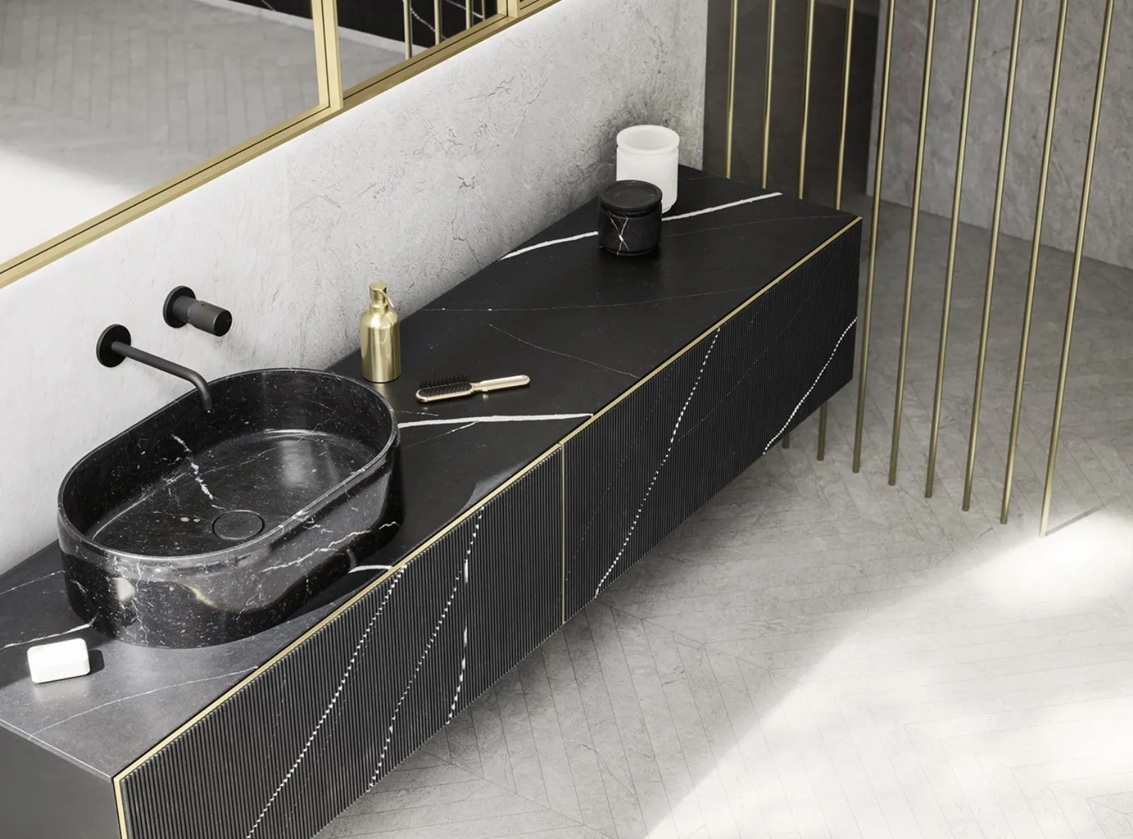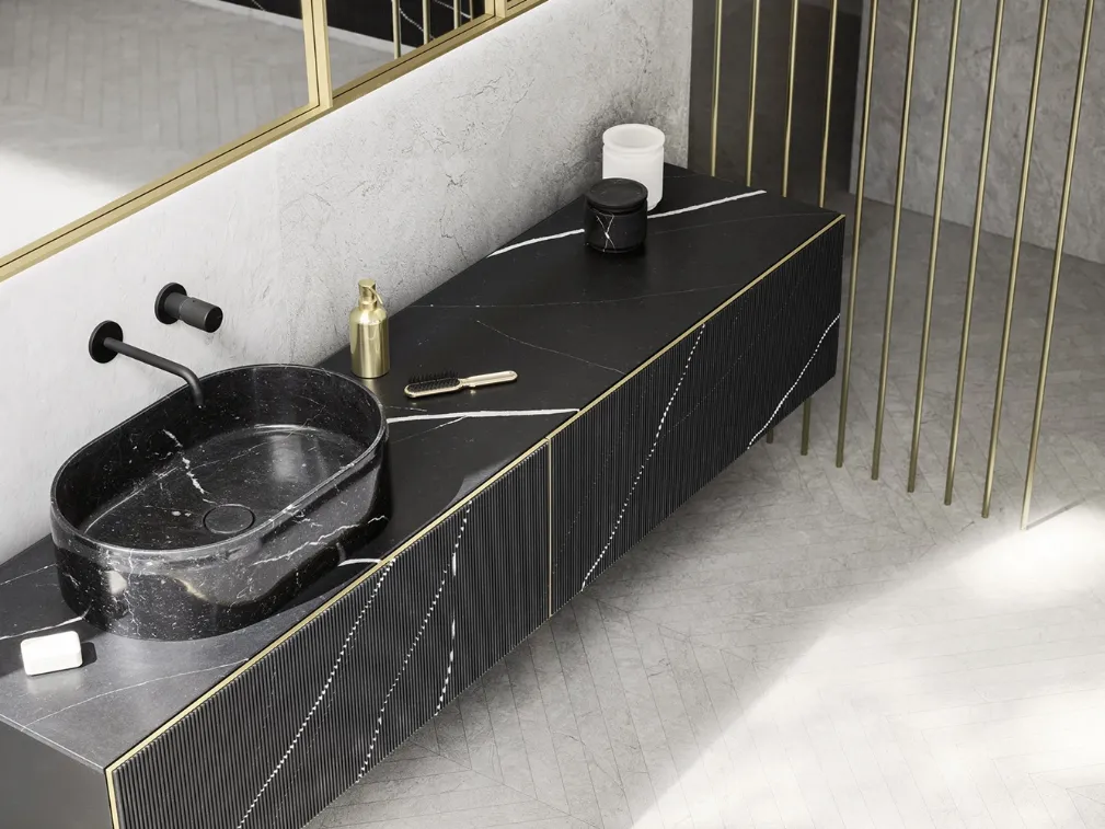 Mobili bagno sospesi in resina minerale del marchio Arbi: clicca e scopri l'arredo bagno design Luxor 04 per il tuo bagno.
