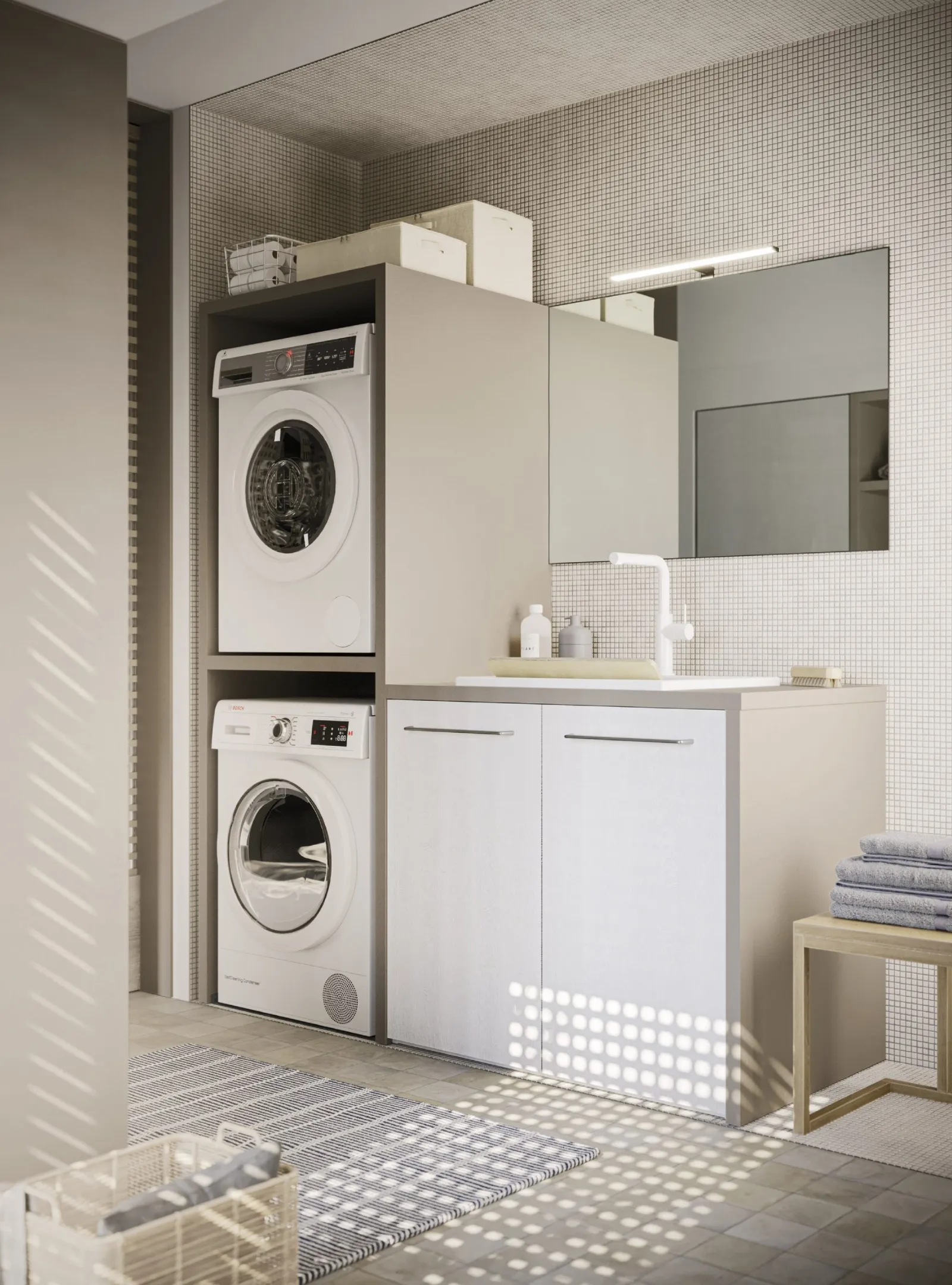 Arreda la stanza del benessere moderno perfettamente con Bolle 05, mobili bagno per lavanderia e complementi in laccato opaco di Arbi.