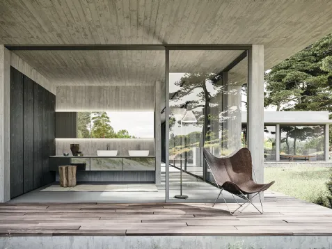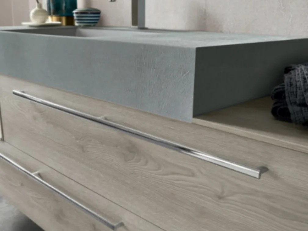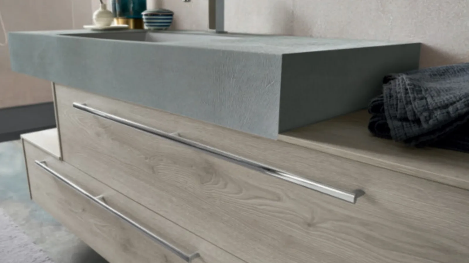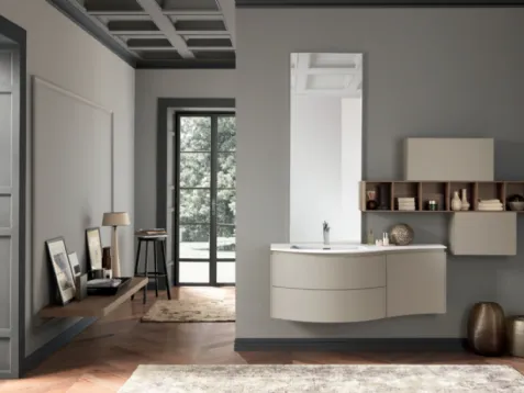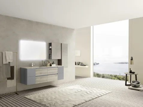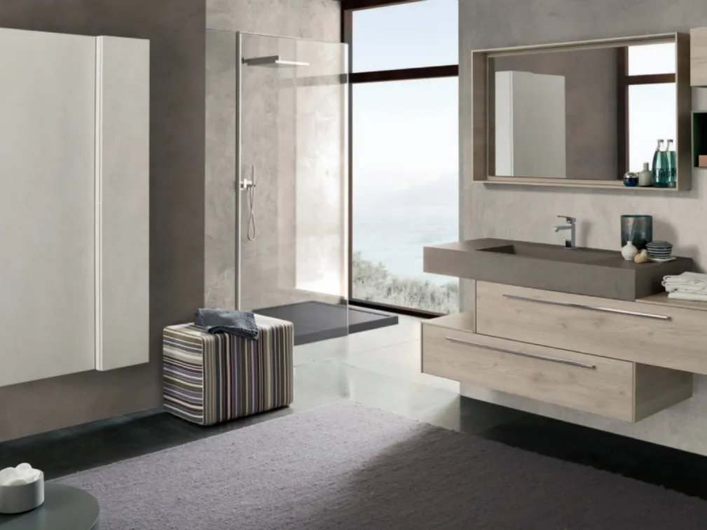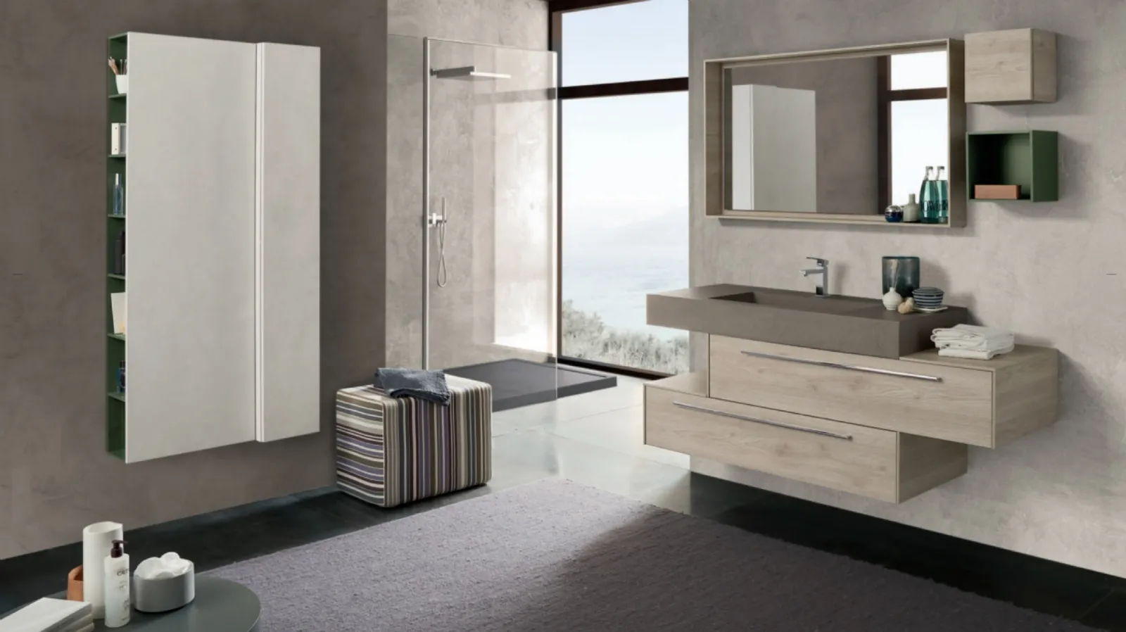 Arreda la stanza del benessere moderno perfettamente con M System C016, mobili bagno sospesi e oggetti in melaminico di Baxar.
