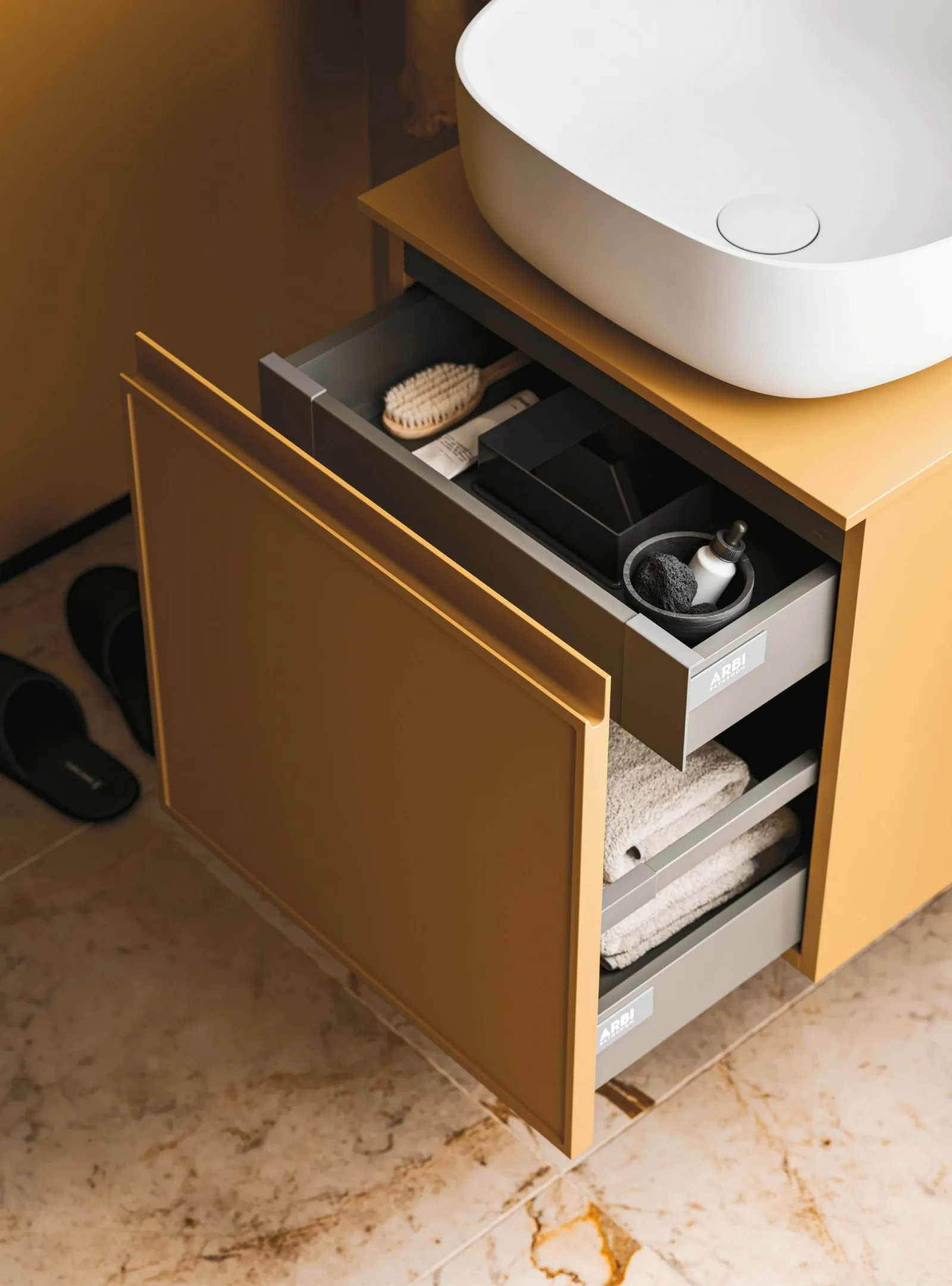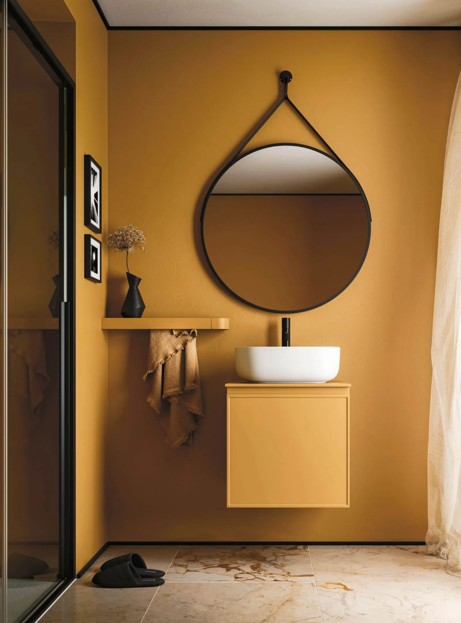 Arreda il tuo bagno moderno alla perfezione con Decor Cozy yellow, mobili bagno sospesi e complementi in laccato opaco di Arbi.