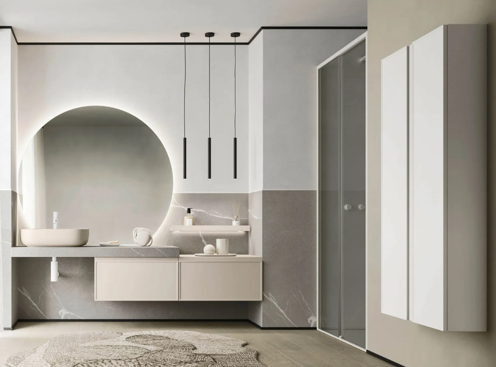mobili bagno sospesi in laccato opaco della firma Arbi: clicca e scopri l'arredo bagno moderno Decor Relax grey per il bagno di casa.