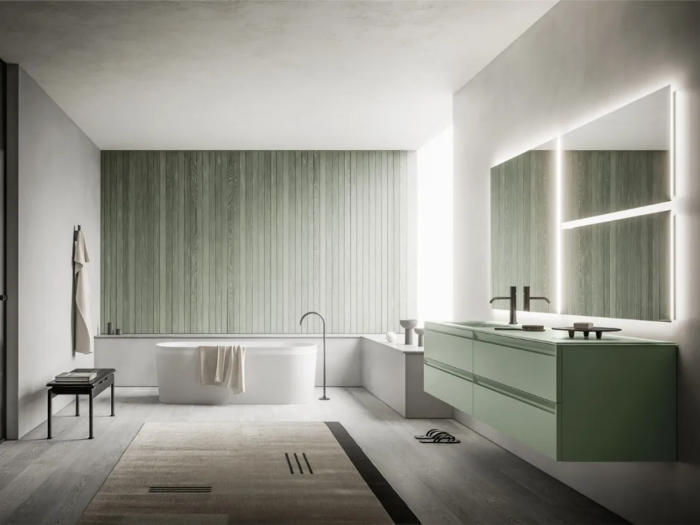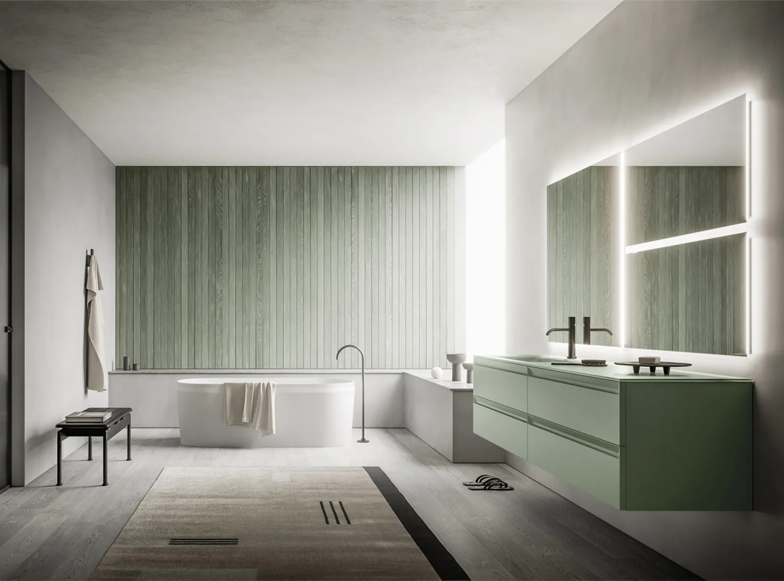 Mobili bagno sospesi in laccato opaco del brand Arbi: clicca e scopri l'arredo bagno moderno Fold 01 per il tuo bagno.