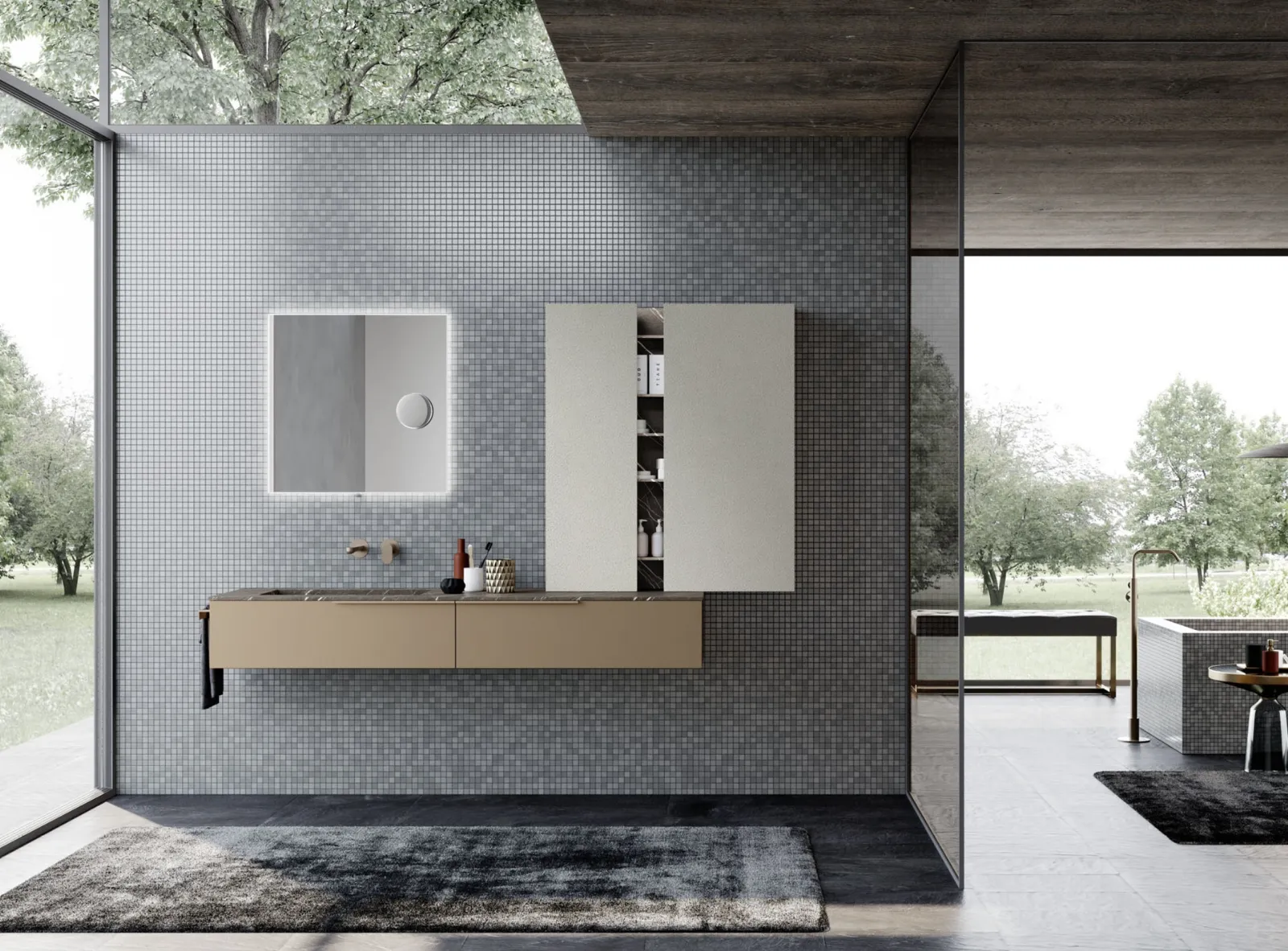 Arreda la stanza del benessere moderno perfettamente con M1 System Upgrade 04, mobili bagno sospesi e oggetti in laccato opaco di Baxar.