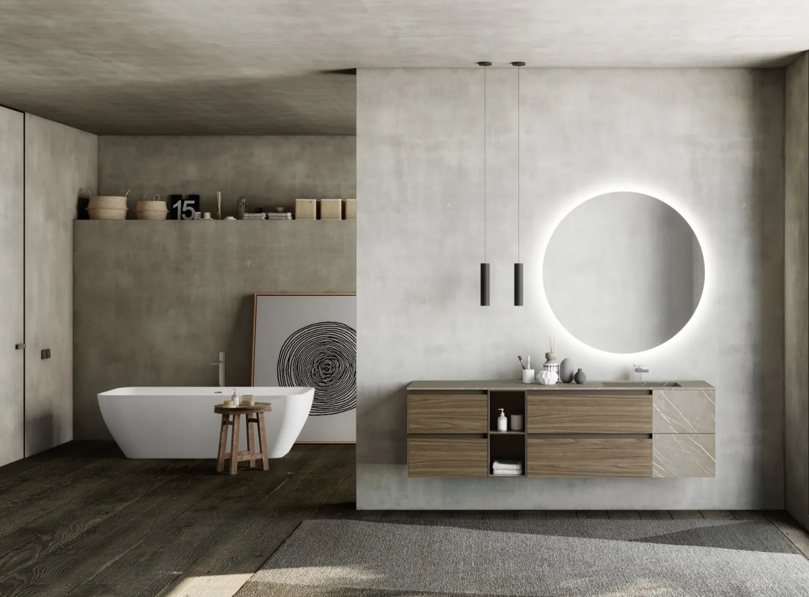 Arreda la stanza del benessere moderno perfettamente con M2 System Upgrade 14, mobili bagno sospesi e oggetti in melaminico di Baxar.