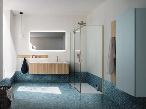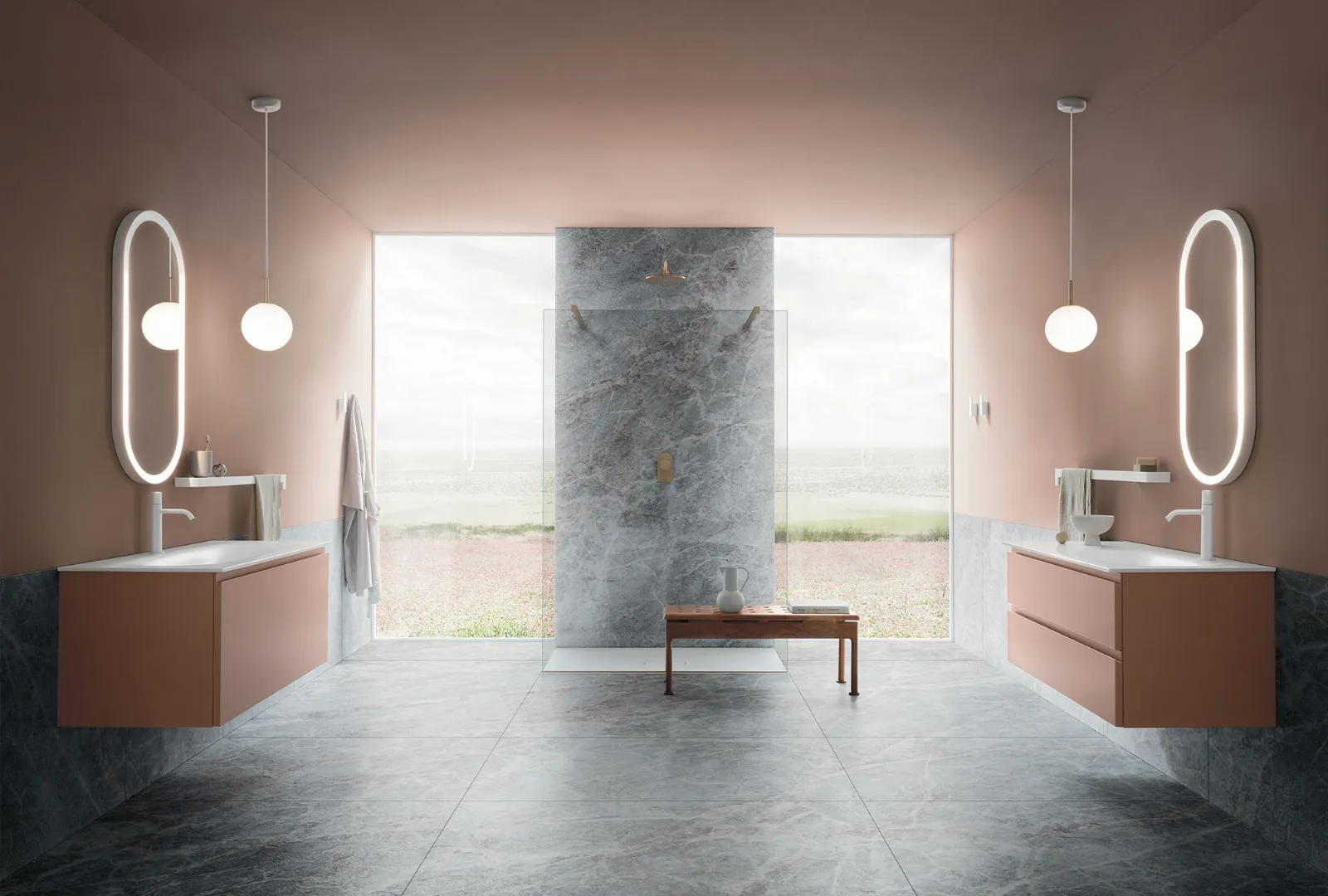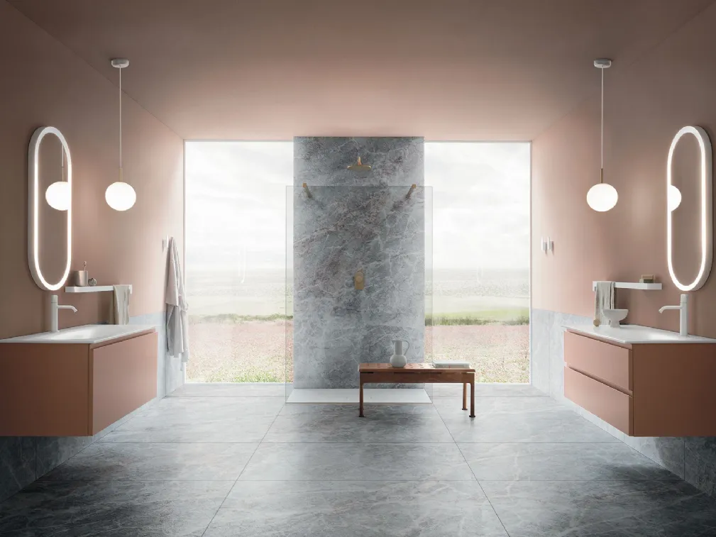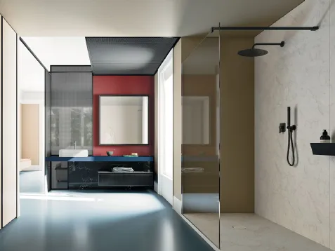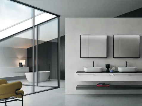 Arreda la stanza del benessere moderno perfettamente con Street 05, mobili bagno sospesi e oggetti in laccato opaco di Arbi.