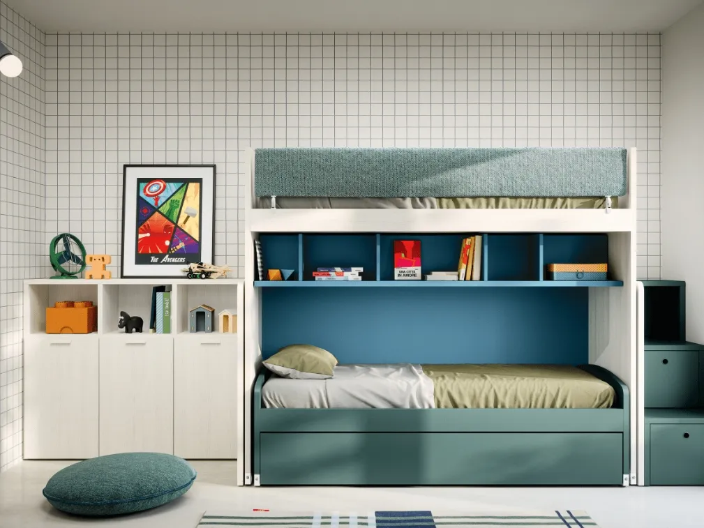 Clicca e scopri di più sulla cameretta per bambini Kids space 12! Le Camerette con letti a castello Nidi ti aspettano.