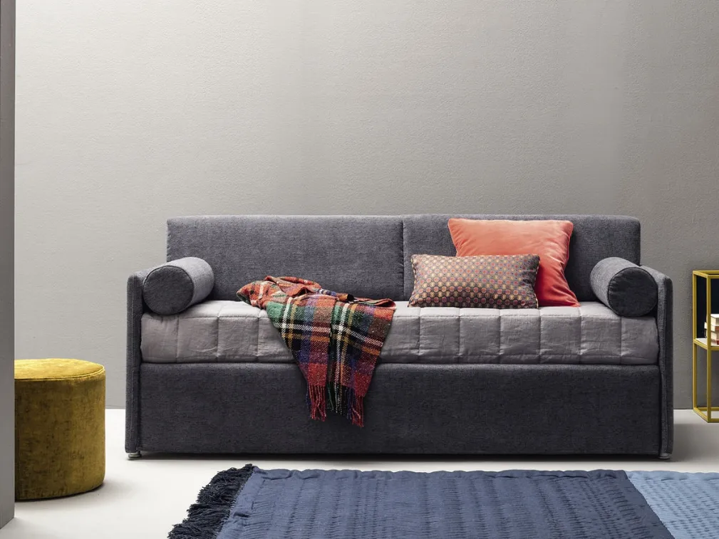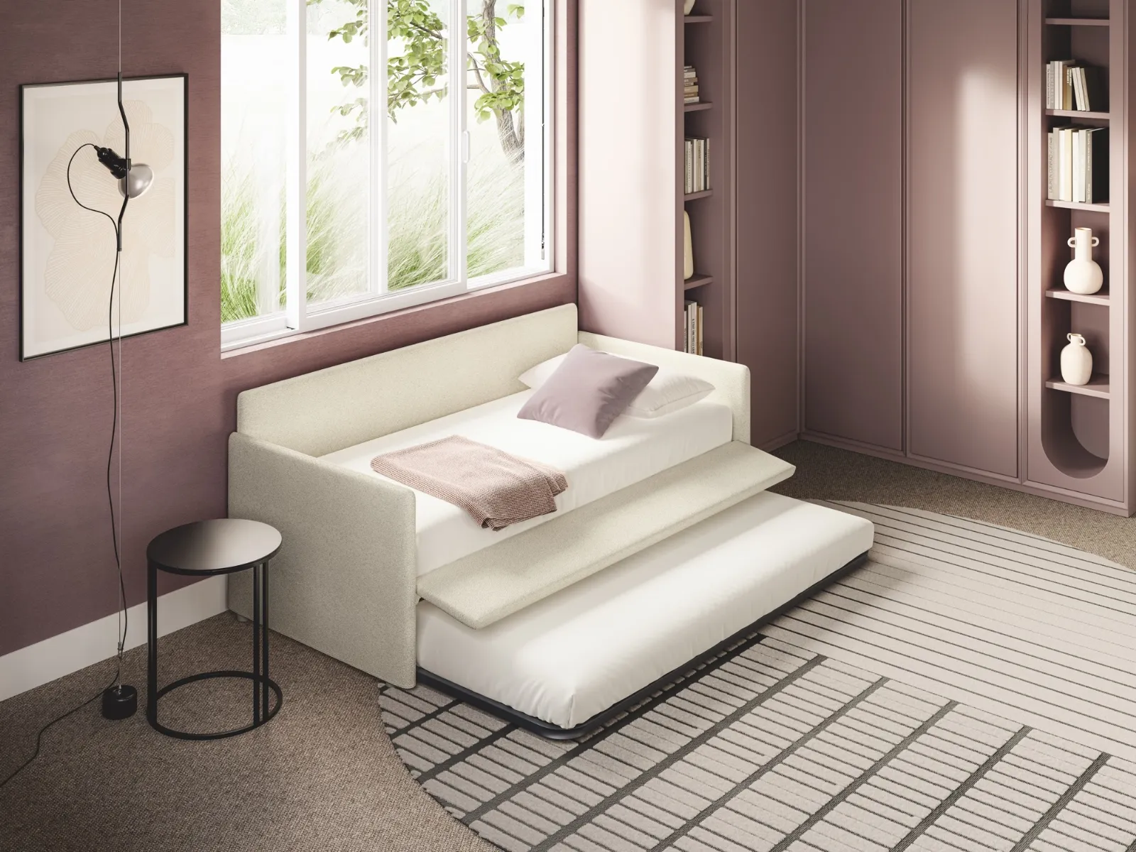 Il letto singolo Maya Mod 5 in tessuto nell'immagine, tra i modelli con letto estraibile moderni di Twils, è ideale per garantire il riposo migliore.