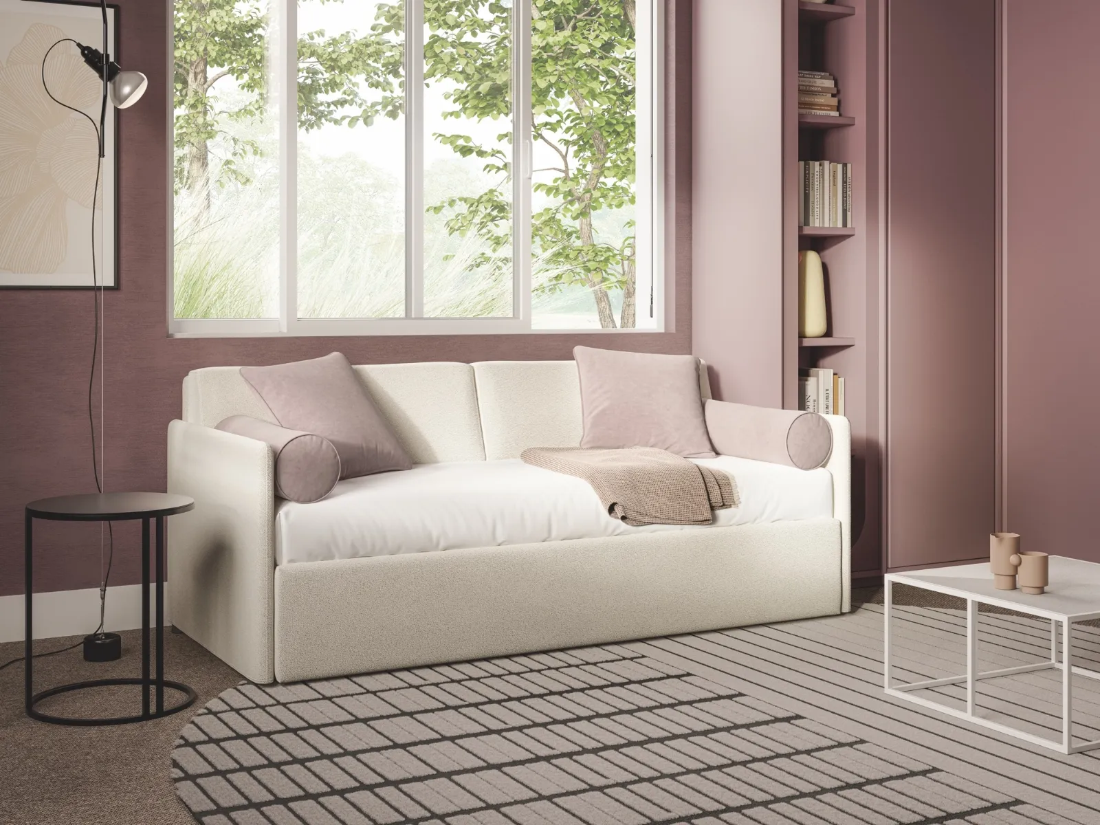 Contattaci e scopri di più sulla nostra serie di Letti singoli in tessuto: arreda la cameretta come l'hai sempre immaginata. Il Daybed singolo Maya Mod 5 di Twils nell'immagine è ideale per completare al meglio la cameretta dei tuoi figli, abbinandosi perfettamente con armadi e comodini, accessori e quant'altro. Se desideri mobili e complementi moderni, il letto singolo nell'immagine fa al caso tuo: #appartiene alla@# nostra serie di letti singoli con letto estraibile. Questo è uno dei prodotti più originali del marchio Twils, garanzia di resistenza nel tempo, qualità delle finiture e uno stile unico.