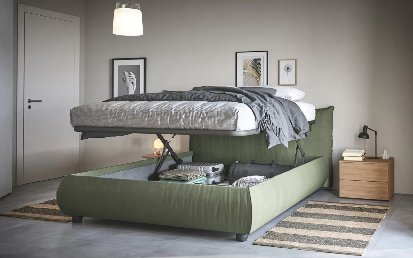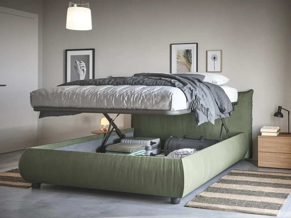 Il letto Thika in tessuto, tra i modelli con contenitore matrimoniali moderni di Cinquanta3, è ideale per garantirti il relax totale.