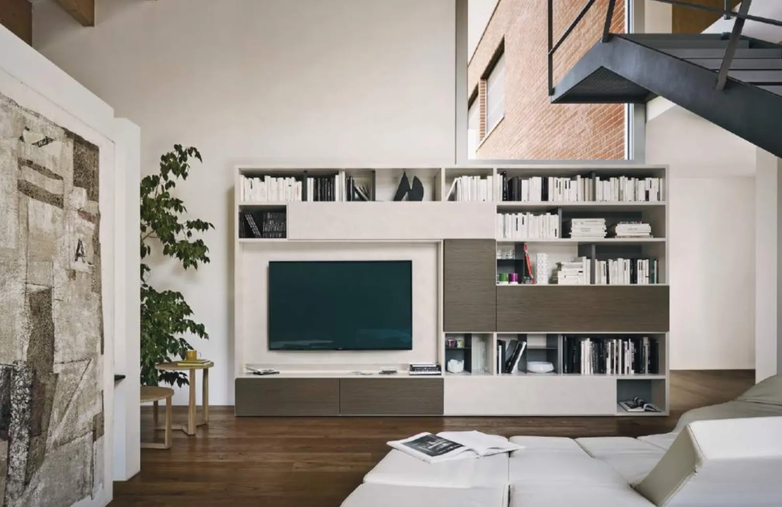 Texture di pregio e linee decise: scopri la libreria Modo Comp M6C73 di Sangiacomo tra le più originali Librerie moderne a muro.