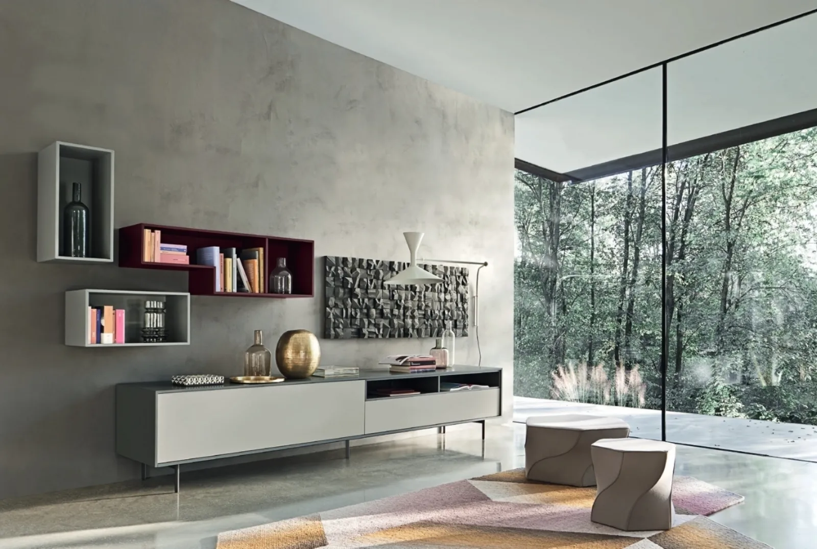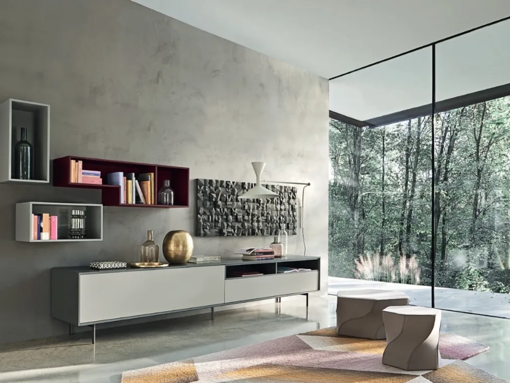 Mobile porta tv per il living Sangiacomo in laccato opaco: clicca e scopri di più sul modello Base Open con riquadro 37, pensato per spazi moderni.