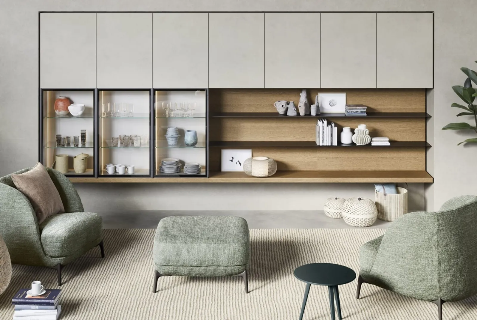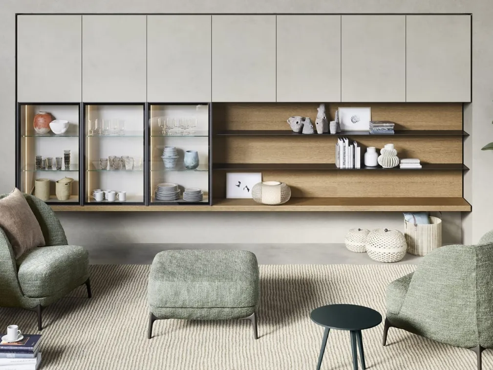 Mobili giorno in laccato opaco del brand Novamobili: clicca e scopri il modello Mensole e piani a muro tra le più belle soluzioni per il soggiorno.