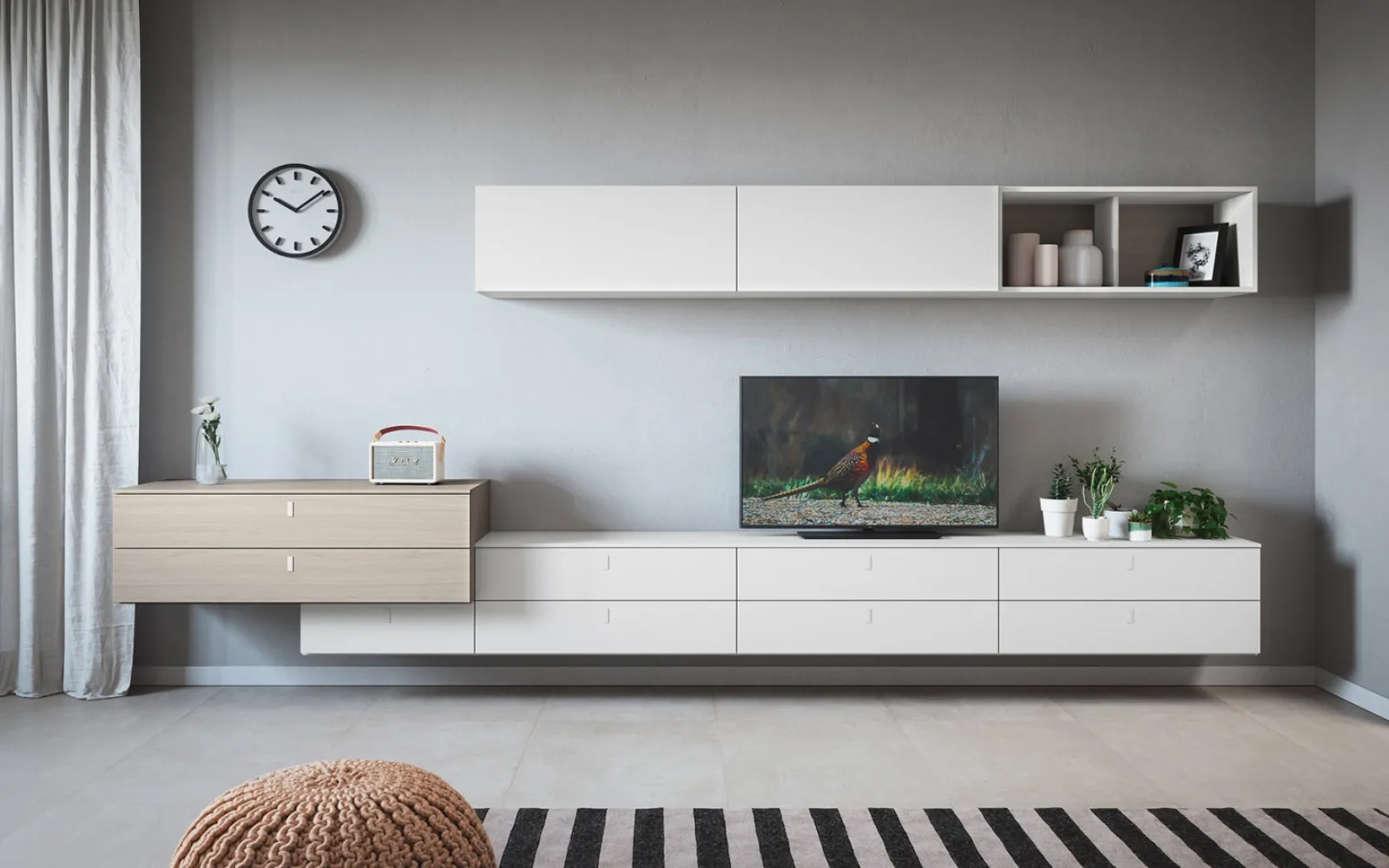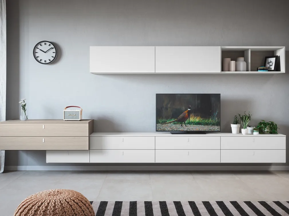 Lasciati stuzzicare da un ricco catalogo di mobili per la zona giorno e troverai la parete attrezzata che fa al caso tuo. I mobili soggiorno in melaminico dalle linee moderne come il modello nella fotografia sono veramente versatili e capaci di arredare il living sfruttando bene ogni angolo. Dato che il living deve essere uno spazio agevole e bello a vedersi, sono indispensabili alcuni mobili belli e pratici come le Pareti Attrezzate. Cinquanta3 mette a disposizione inediti modelli di mobili soggiorno, diversi per stile e conformazioni, texture e accessori: scopri in negozio l'Arredamento Casa dei migliori brand. La Parete Attrezzata con base sospesa 07A di Cinquanta3 nella fotografia è una delle più originali soluzioni d’arredo sul mercato: componibilità su misura e le diverse possibilità di progettazione la rendono bella e di grande qualità.