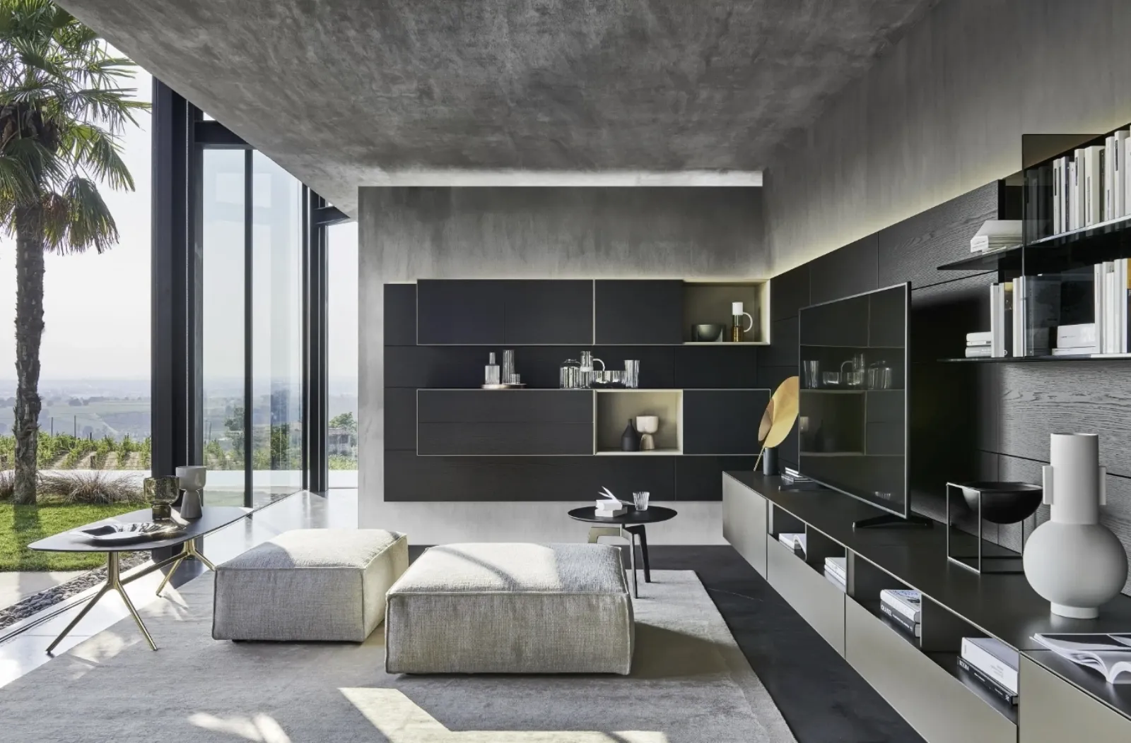 Vuoi ammobiliare un living pratico e dinamico? Ti offriamo la parete attrezzata Domino Boiserie 06 Sangiacomo dalle linee decise moderne.