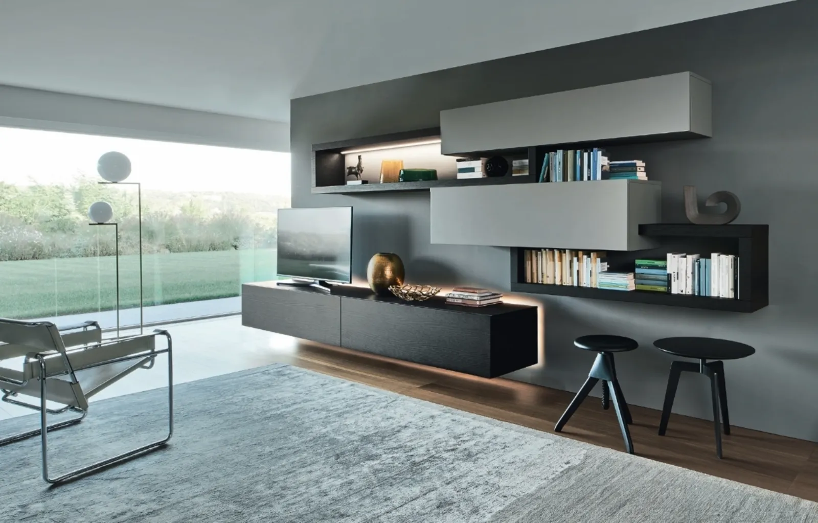 Clicca e scopri di più sulla parete attrezzata Lampo L6C17 della firma Sangiacomo: è la soluzione dalle linee moderne perfetta per te.