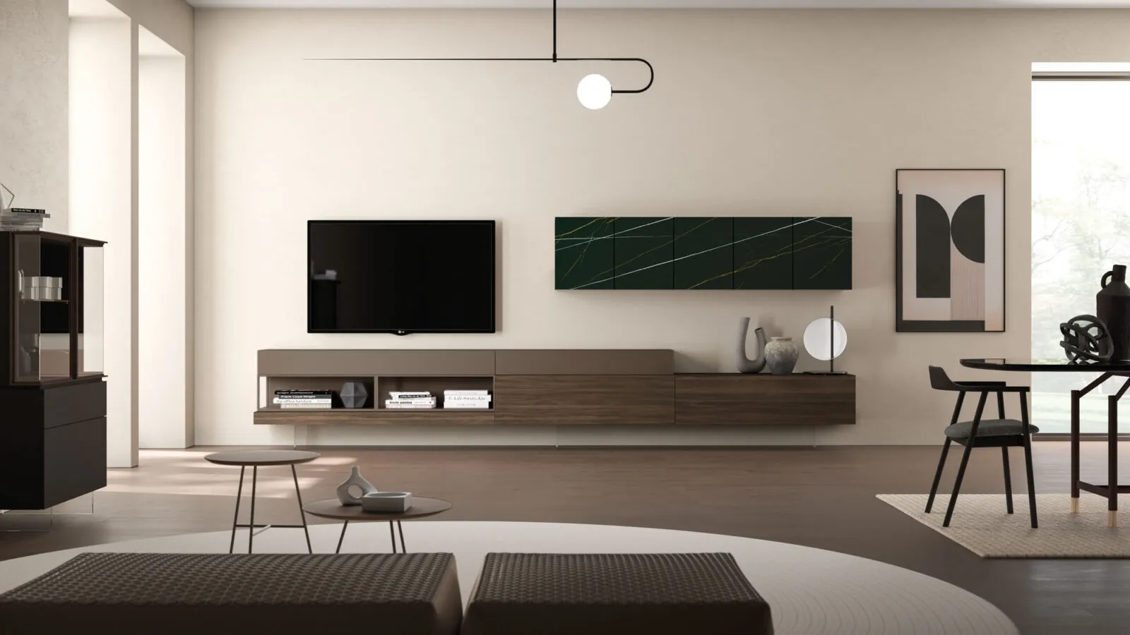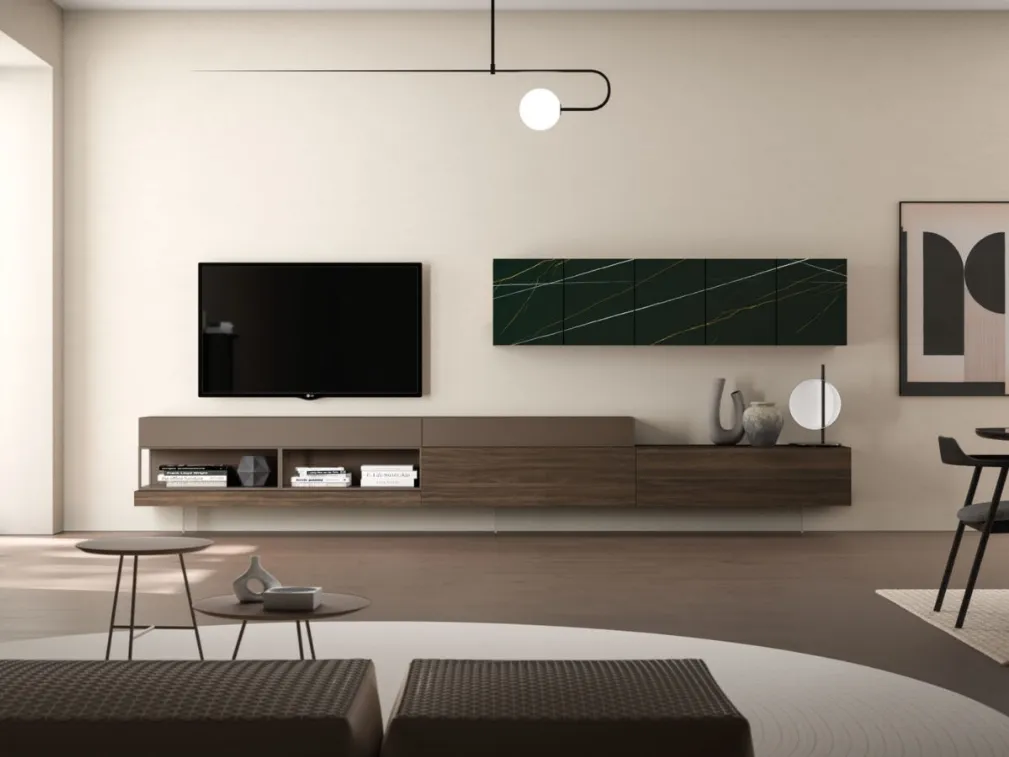 Vuoi progettare un soggiorno dinamico e operativo? Ti presentiamo la parete attrezzata Modulo Day 14 Orme dalle forme decise moderne.