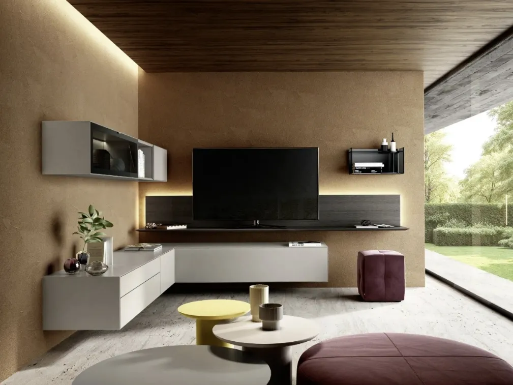 Vuoi allestire un soggiorno operativo e pratico? Ti presentiamo la parete attrezzata Domino 05 Sangiacomo dalle forme decise moderne.