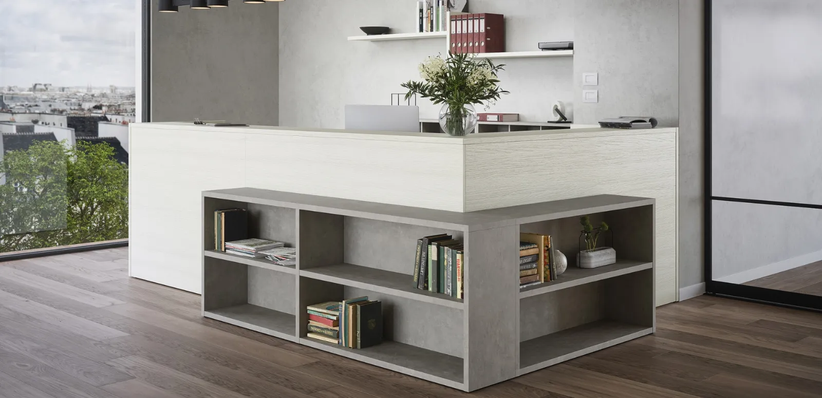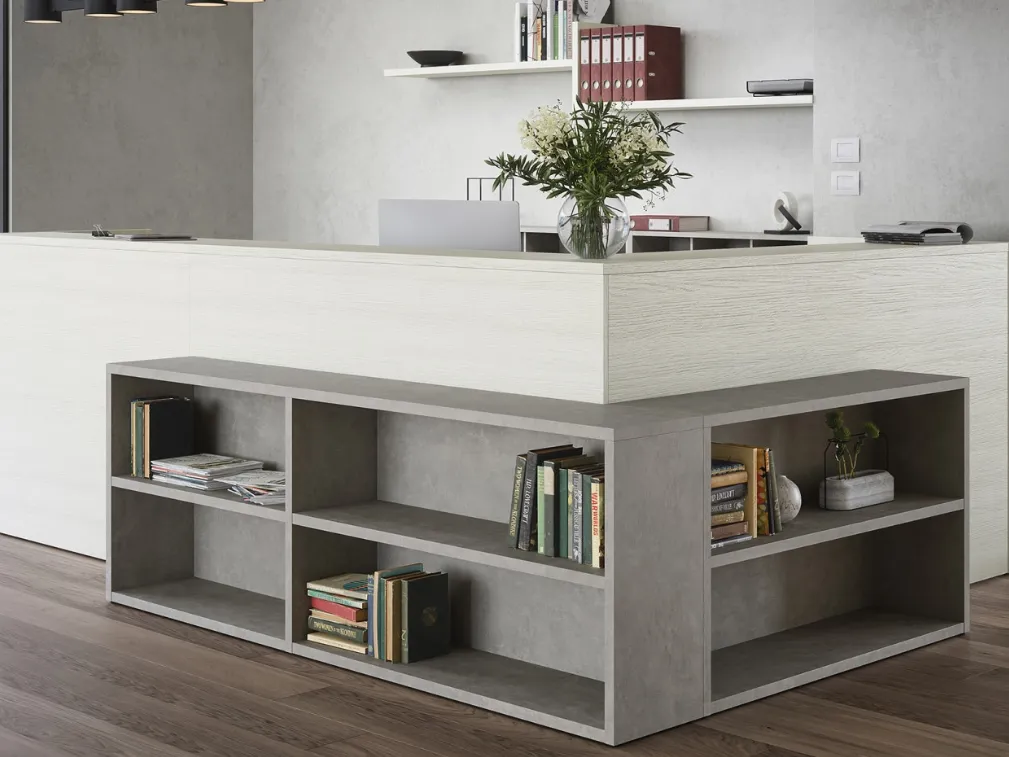 Se vuoi ultimare l'ambiente lavorativo, eccoti il modello Bancone Reception 07B di Cinquanta3 tra differenti soluzioni di banconi reception.
